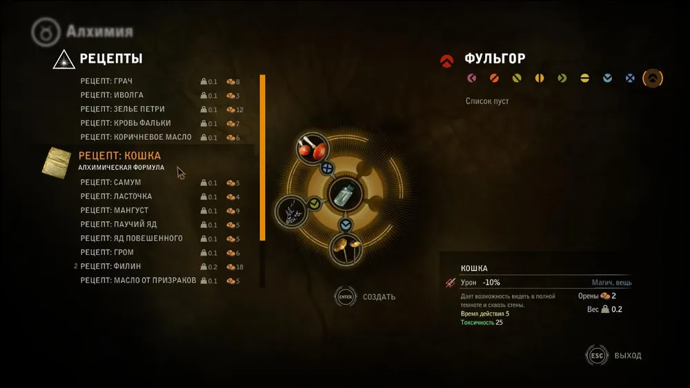 Для того чтобы приготовить микстуру или бомбу, войдите в режим медитации, а затем в панель алхимии. С левой стороны вы увидите список рецептов, которые уже знаете, а с правой — алхимические ингредиенты, которые есть в вашем распоряжении. Внизу экрана показана комбинация, в которой следует соединить алхимические субстанции, чтобы получить данную микстуру. Для этого вы можете вручную добавлять каждую из этих субстанций, просматривая список справа, или использовать возможность автоматического заполнения ячеек. В последнем случае центральная панель сама будет заполняться субстанциями, необходимыми для данного рецепта. Когда вы соедините ингредиенты в правильной последовательности, получится зелье, которое затем добавится к вашему снаряжению.