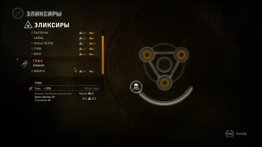 Действие: Увеличивает шанс нанесения критических эффектов: поджигание знака Игни, сокрушительный удар Аард.Токсичность: низкая.