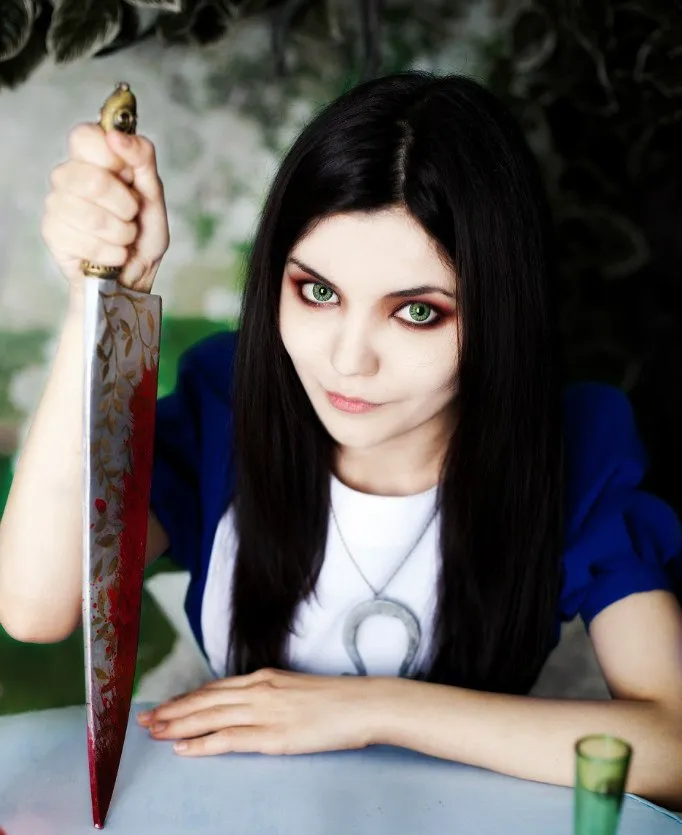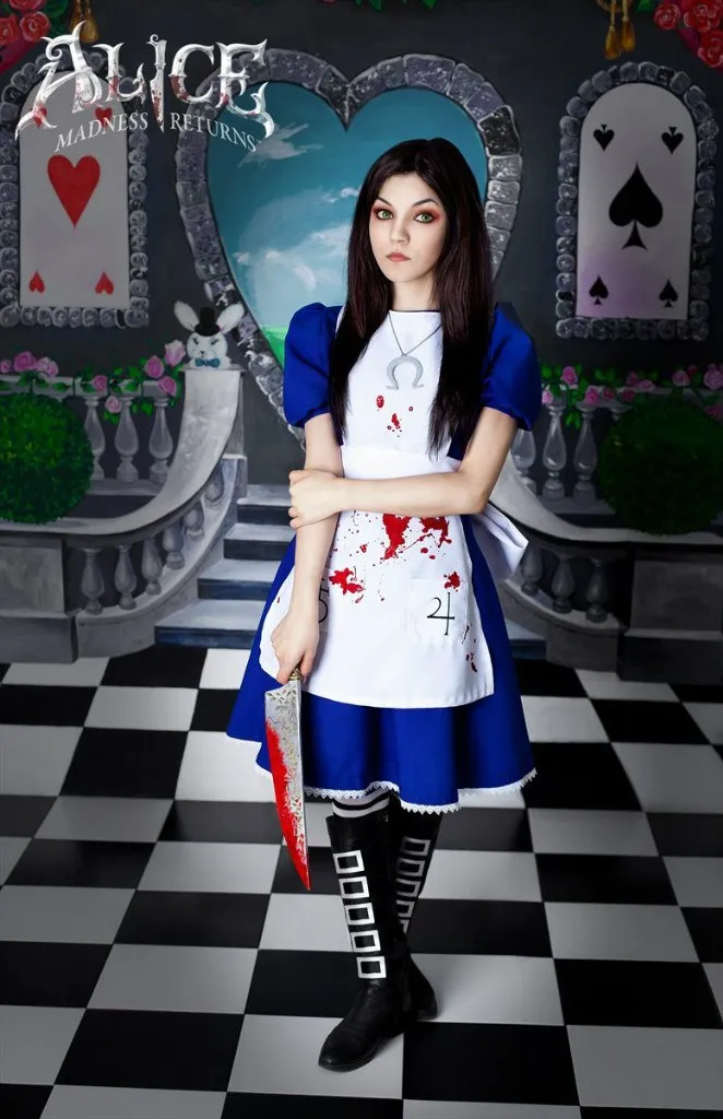 Именно. Алиса только чуть хмурит брови иногда. Мимика у нее в "реальной" части игры, там, где у нее другое платье совсем. Так что тут все хорошо.
