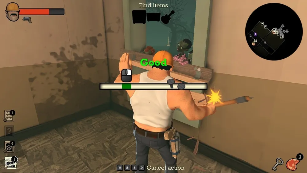 Решение было крайне эффективное, но несколько запоздалое. Зомби уже успели заполонить город, улицу, залезть во двор и даже вломиться в дома честных граждан. Суровый строитель Джек, брутальная полисменша Фокси и жертва Макдональдса Майк пытаются удержать последний оплот и собрать гитарную установку. В игре нам предстоит отыскать 3 ключевых предмета и исполнить спасительный трек, попутно круша в щепки уютное жилище. Стулья, шкафы, комоды и сантехника в ванной разносятся одинаково быстро и дают материалы для защиты убежища. Разломав пару шкафов и журнальный столик, мы сможем заколотить сразу несколько окон, что остановит мозгоедов на какое-то время.
