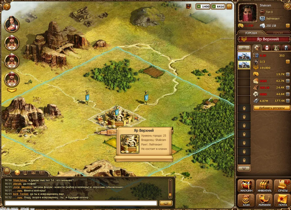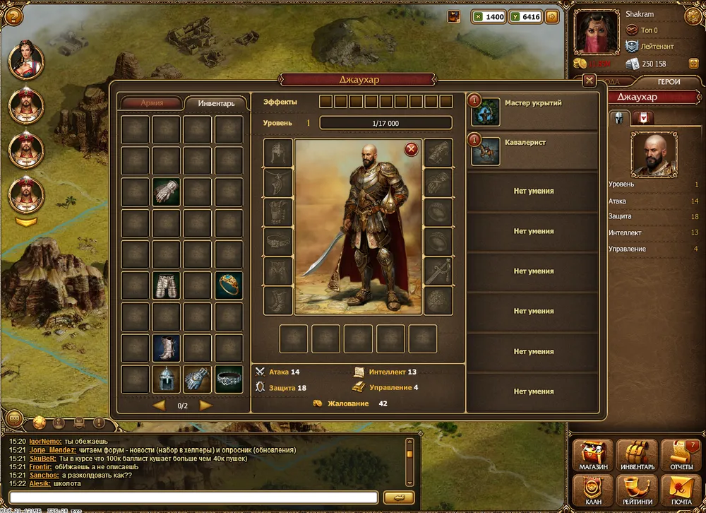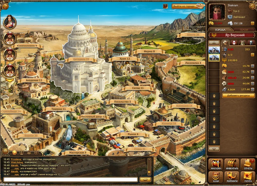 Разбираться с экономикой, строительством и другими вещами в экране города очень интересно, но у Rise of Heroes имеется и другая, не менее увлекательная сторона – стратегическая. Игра располагает обширной картой, на которой можно обнаружить леса, горы и реки, вражеские и союзные поселения, дающие прибавку к ресурсам фермы, лесопилки и другие строения, руины давно почившей цивилизации и прочие таинственные места, которые хочется посетить и исследовать. Но любая из провинций, если она, конечно, не принадлежит игроку, заселена разного рода варварами, которые очень не любят, когда к ним вторгаются без приглашения. Да, без войны не обойтись – таковы реалии Rise of Heroes. Следует отметить, что перемещаться по карте самостоятельно войска не могут – им нужен командир. В качестве таких командиров и выступают герои – персонажи с разными умениями, навыками и характеристиками. Прикрепив к герою армию, в которую могут входить как пешие и конные отряды, так и артиллерийские и воздушные формирования, игроку только и остается, что отправить того в бой, дабы ощутить сладкий вкус победы или почувствовать горечь поражения. Но лишь сражениями с ордами варваров дело не ограничивается, так как у халифа имеются более серьезные соперники – другие игроки, стремящиеся занять доминирующее положение в регионе. Именно с ними приходится воевать, что называется, не на жизнь, а на смерть, выпуская в бой тысячи, нет, десятки тысяч бойцов, готовых умереть за своего повелителя.