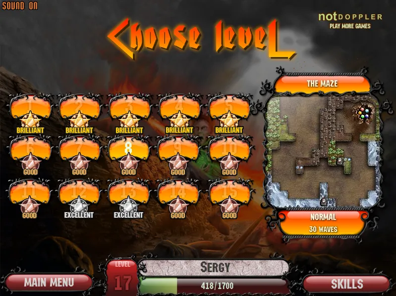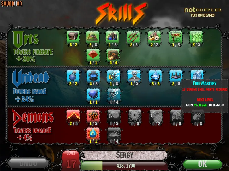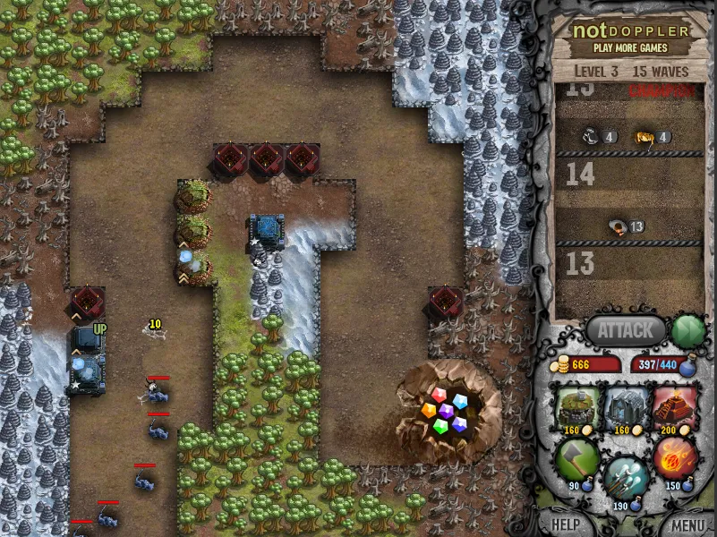 Так же в игре есть манна, которая тратится на 3 заклинания: Рубка леса (очищает занятые поля), усиление башенок на короткое время и метеорит. Всё это можно улучшить с помощью навыков, которые даются при получении нового уровня.