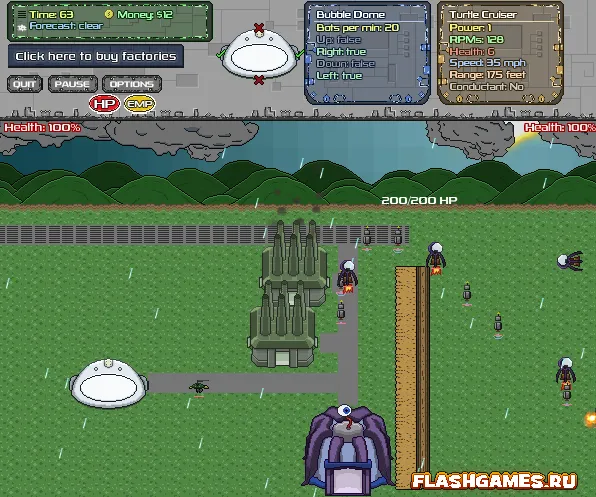 Всего в игре есть 3 вещи, которые мы можем сделать. Первая – покупать фабрики и улучшать их. Вторая и третья – ремонтировать стену за деньги и разом убить всех [/s]Человеков[/s] роботов на карте. За убийство каждого супостата вам капает небольшая денюжка, на неё то мы и апгрейдим здания и покупаем новые. Отсюда и рождаются разные тактики, применимые в игре. Например, можно построить слабых, но быстрых роботов. Или наоборот, сильных, но медленных. А можно вообще ничего не улучшать, наделать их овер 9000 и посмотреть, что из этого выйдет.