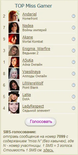 - Появилось пользовательское голосование Miss Gamer. Победительнице гарантировано «место в тройке победительниц». Как и через какой обход правил это будет реализовано — неизвестно. Возможно, имеется в виду банальный «приз зрительских симпатий», но проголосовать всё равно стоит. К слову, благодаря эксперименту, суть которого в том, что голосование в первую неделю происходит «в тёмную», порядок цифр прямо-таки концептуальный.