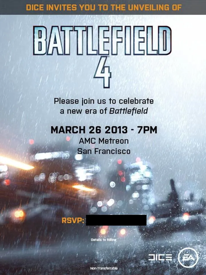 1) Надпись на инвайте гласит:"DICE приглашает Вас на показ Battlefield 4"; "Пожалуйста, присоединяйтесь к нам, чтобы отпраздновать начало новой эры Battlefield"