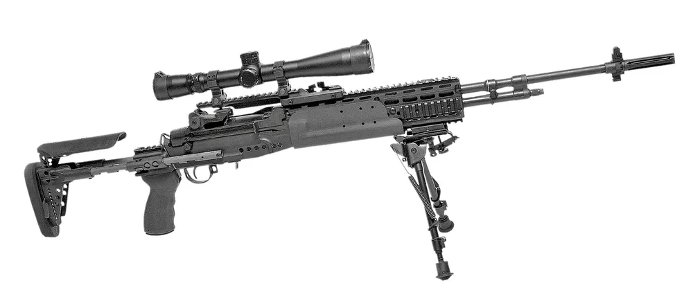 2) На солдате висит винтовкаMk 14 Enhanced Battle Rifle (EBR) с сошками и глушителем, а в правой руке он держит пистолет Glock 17 с тактическим фонариком.