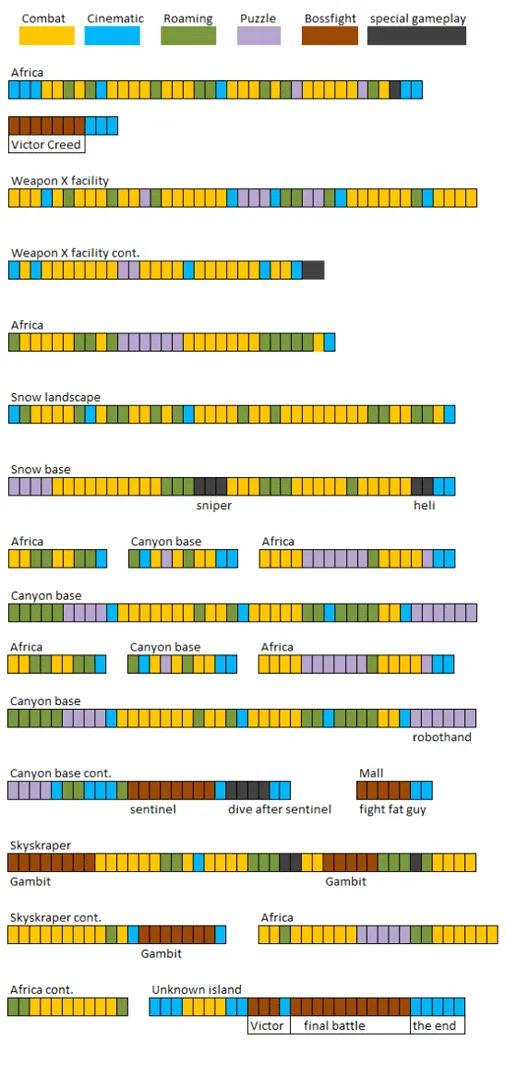 Если смотреть на различия, мы видим, что в главе «Snow Landscape» в Wolverine игра переключается только между боями и роамингом, в то время как Batman разбавляет поединки чем-то другим. Битвы с боссами в Arkham Asylum равномерно распределны по всей игре, что намного интереснее и чаще вызывает «вау-моменты» по сравнению с «Росомахой», где все битвы с боссами свалены в кучу в конце.