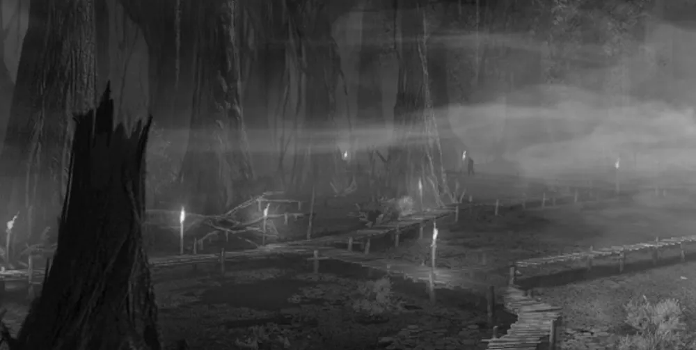 Выглядит очень загадочно, темно, влажно, мутно и, может быть опасно. Кроме того, напоминает болотный лагерь из первой Готики.