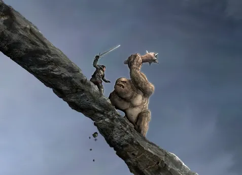 1. Человек сражается с троллем на краю скалы-моста. Броня человека похожа на броню паладина из Г3, а тролль на тролля из Г3.