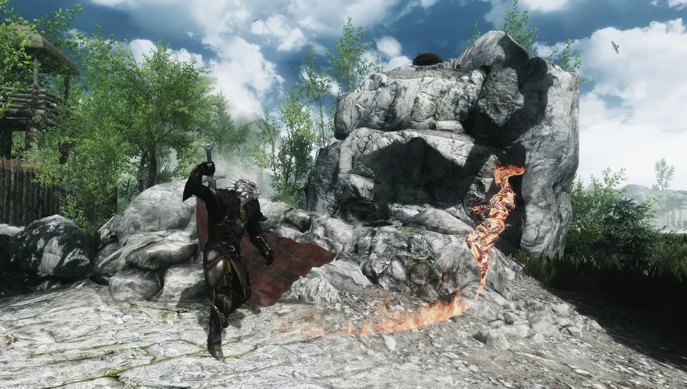 Стоп-кадр возле местечка, под названием Барнвилл. Странник-аргонианин в эбонитовом обмундировании начинает бой с огненных атронахом. Слева от места схватки, мы видим пустующую сторожевую вышку. Видимо, местная стража не слишком беспокоится о гражданах. А вдалеке справа - мемориал, установленный бойцам, погибшим в одной их войн Второй Эры.