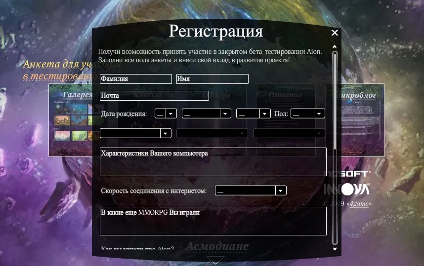На промо-сайте www.aion.ru русской версии игры Aion появилась анкета для участия в закрытом бета-тестировании: