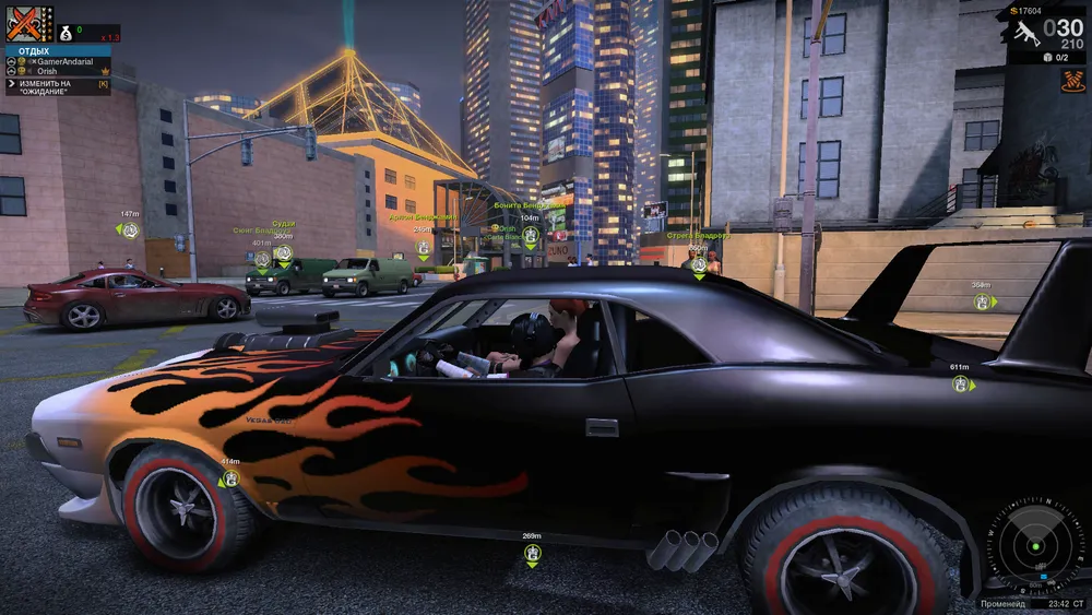 Отдельное слово стоит сказать о возможностях кастомизации. Декорирование машин и оружия вполне приятное дополнение, а уж стилизация персонажей и вовсе особая песня. Кроме уже упомянутых выше костюмов от Orish'а, впечатавшись развязной атмосферой игры я организовала себе такой вот костюм нудиста. Ну кто же виноват, что у них в магазине продаются такие силиконовые штуки? Они провоцируют. Внимание на кроссовки — бегать без обуви по такому неблагополучному городу я сочла верхом безумства, поэтому ступни были надежно защищены. Надеюсь, что не меня одну улыбнул этот забавный вид. Я за красиво украшенных персонажей, но это захотелось сделать джаст фор фан.)