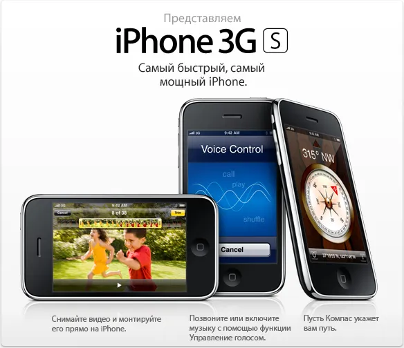 iPhone 3GS обладает более быстрым, чем iPhone 3G, процессором. Он также оснащен трехмегапиксельной камерой с автофокусом, а не двухмегапиксельной камерой, как его предшественник. Новое устройство способно записывать видео и выполнять голосовые команды. Кроме того, выпущена 32-гигабайтная модель iPhone 3GS. Устройства с таким объемом памяти в предыдущей линейке смартфонов Apple нет.