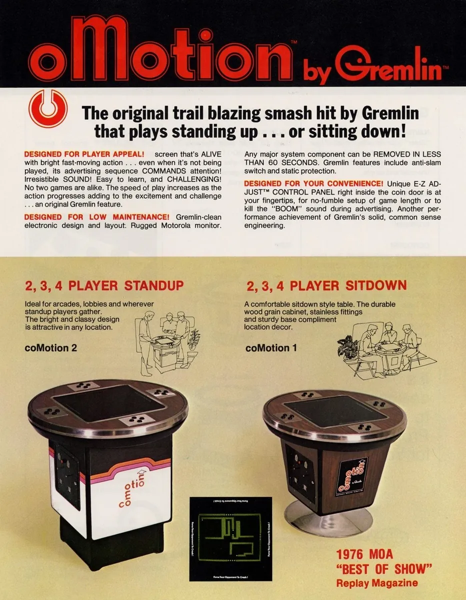 Итак: эта игровая машинка являлась круглым столом около 120см в высоту. Столешница была деревянной, и у нее было четыре набора игровых элементов управления, равномерно расположенных вокруг стола. Монитор располагался внутри стола лицевой стороной вверх.