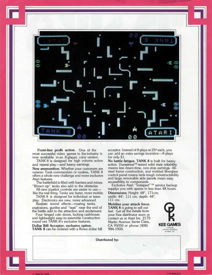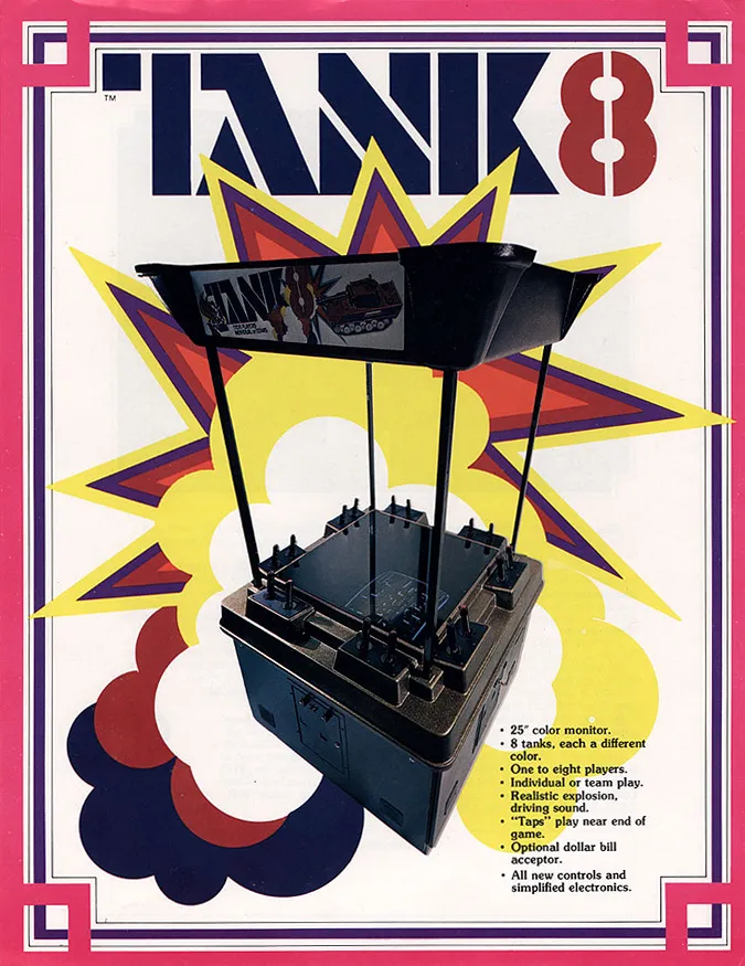 Игра третья в серии и цифра 8 означает возможность играть восьмерым на одном аппарате. Геймплей очень напоминает мною любимые дендивские танчики, правда без баз и с отсутствием ИИ. Не смотря на то, что в игре запрограммирован простенький ИИ транслируемый на экране привлечения, маркетологи Атари настояли на отключении его при запуске игры. Обусловили это тем, что когда танки начинали двигаться под управлением ИИ, игроки думали будто именно они играют, забывая закидывать деньги в автомат.