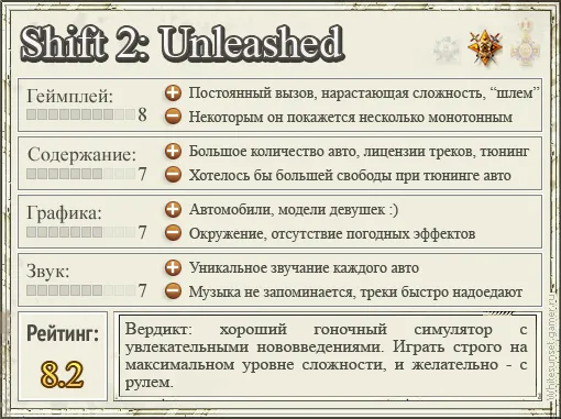 К сожалению, я не отыграл положенное количество часов в легендарных консольных симуляторах. Потому сравнений Unleashed с ними в данном обзоре – ноль. И даже если попробовать провести параллели, то вывод все равно напрашивается один: новый Shift – прекрасный повод бросить себе вызов, сев за руль своего любимого авто. А любопытные нововведения и знакомая уже система Autolog преподнесут суровые будни гонщика в совершенно ином свете. Главное здесь – запастись геймпадом или рулем, ибо вождение спорткара с помощью клавиатуры в конечном счете приведет к раку пальцев. Будьте осторожны.