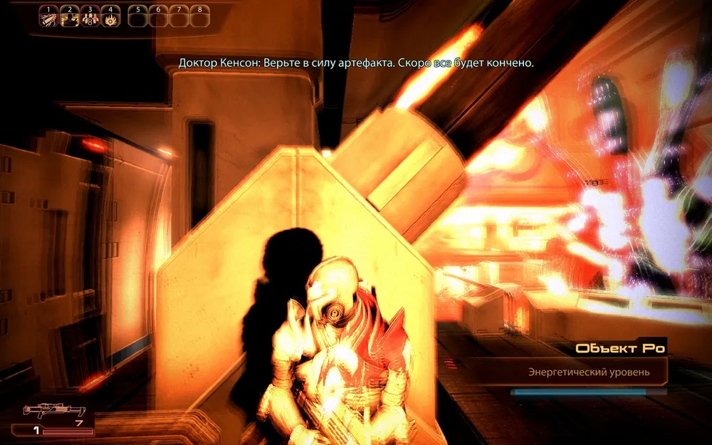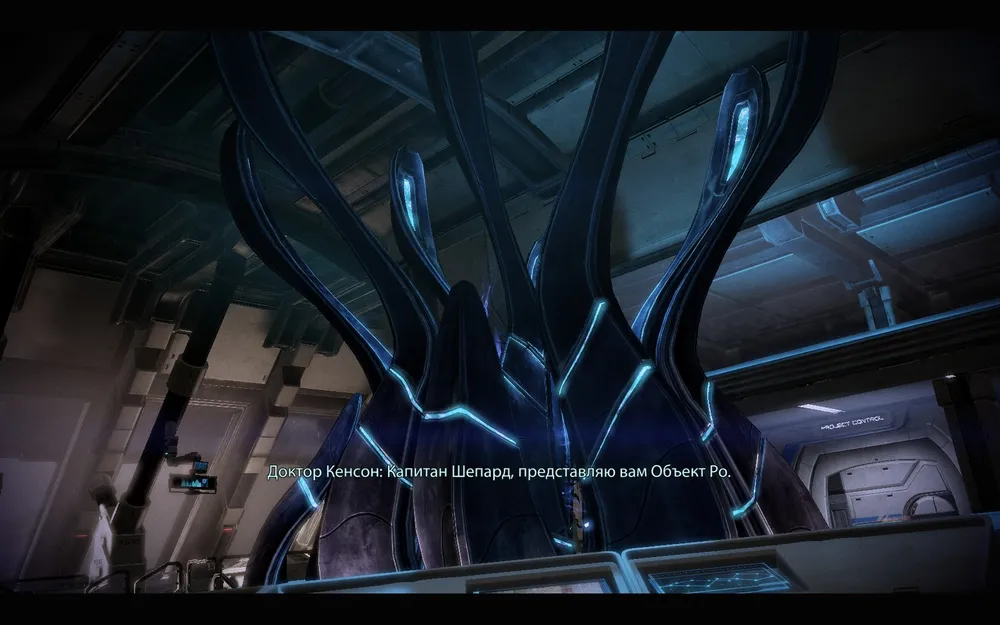 Становится понятно, что мер безопасности при обращении с артефактом не хватило, чтобы он не смог повлиять на команду базы. Шепард выбивает пистолет у Кенсон, но на подходе местная охрана, а доктор сбегает.