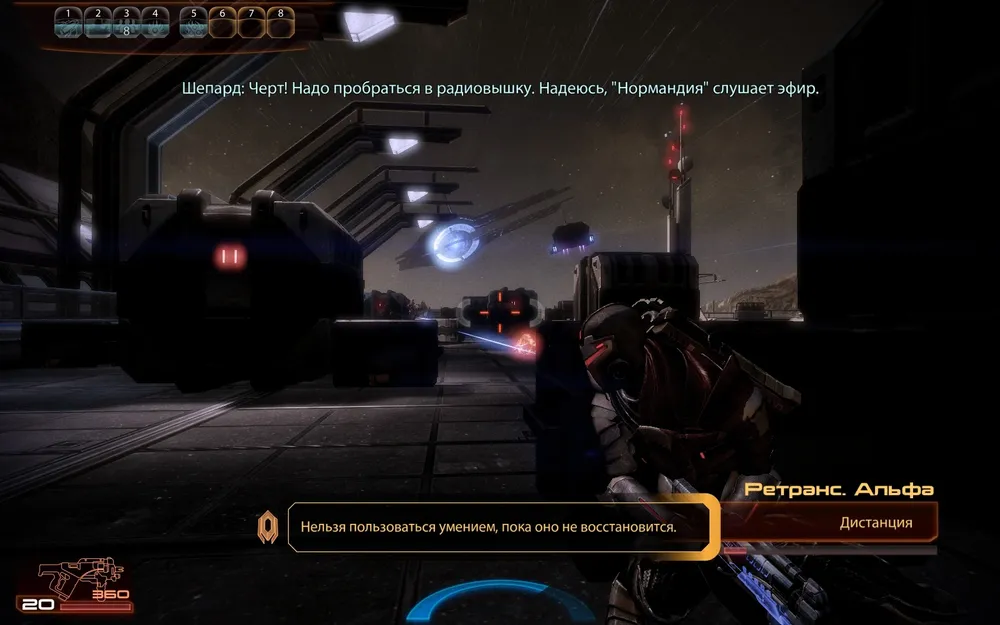 Астероид продолжает нестись на ретранслятор, а нам нужно уносить ноги. К сожалению, "Нормандию" вызвать не удается, приходится пробиваться к радиовышке. Путь наш лежит под открытым космосом, так что мы вдоволь можем любоваться ретранслятором (главное — не заглядеться, а то Шепард познакомится с ним поближе).