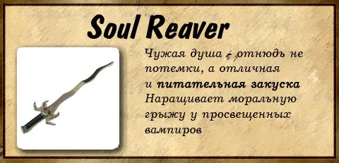 Во-первых, перестань думать только о себе и поставь своей девушке, которая ждет, когда ты дочитаешь этот пост, легкую и расслабляющую музыку. Во-вторых, запусти ей на ноутбуке World of Goo, чтобы лишний раз не пришлось отвечать, что такие Каин и Разиэль и чем это они интереснее Верховного Главы КНДР, которым произрастающая поблизости пресса трындит уже не первое десятилетие. Только после этого можешь приступать к очередному прохождению саги Legacy of Kain (извините, уважаемые девушки, но варианта для вас придумать так и не сумел – простите, ради бога). Объяснять ценителям и фанатам, чем клинок Soul Reaver провинился и почему попал в наш арсенал бесполезно. Неофиты ничего не поймут, пока сами не попробуют окунуться в удивительный мир Носгота. Но свое место Soul Reaver заслужил. Все-таки он играет важнейшую роль в историях обоих героев. Этот необычайной подвид холодного оружия не довольствуется свежей кровью своих врагов. Soul Reaver, не забывая о собственном зычном названии, требует их души в неопределенном количестве. Испытывая вечный голод, он иссушает своего хозяина, в обмен придавая протагонисту небывалую силу. Казалось бы, неплохой размен. Но герои серии из-за этой особенности испытывают адские муки.