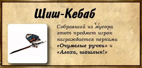 Изобретательные люди везде найдут свою, избранную тропинку. Неважно, как кончится их эксперимент – полным провалом, тюремной клеткой или зажигательным шоу с участием миллионов. Главное, эти люди нашли дорогу на страницы истории. Если верить передаче «Пока все дома», товарищи, собирающие из пластиковых бутылок вечный двигатель, минимойку или сад камней, пользуются среди знакомых невиданной популярностью. В опустошенном мире Fallout 3 умение сотворения конфетки из бурых масс ценится как нигде. Дефицит материалов в постъядерной Америке дает о себе знать. Поэтому люди с исключительно прямыми руками и трезвым рассудком собрали Шиш-Кебаб – мощнейшее оружие ближнего боя в триквеле. Собирается данное чудо научно-технического прогресса из подручных материалов, на зависть «Команде А». Всего-то нужно лезвие газонокосилки, поношенный бензобак, стартер и ручного тормоза мотоцикла. Шиш-Кебаб нанизывает противников одного за другим, не давая им времени на предсмертный писк, и слегка поджаривает изнутри, делая их мясо более сочным и пропеченным. Называется этот меч так не случайно. В переводе на общедоступный и относительно литературный русский, это слово означает «шашлык». Что отлично описывает действие Шиш-Кебаба без лишних разглагольствований.