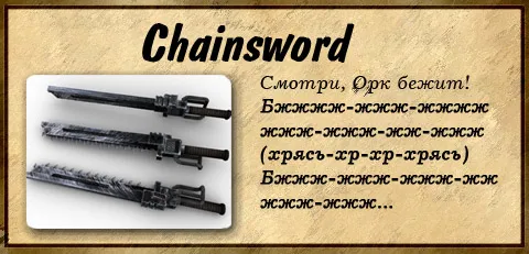 Заводи мотор, Сергеич, поедем гусей давить. Нет в мире ничего более интересного, нежели ежедневные упражнения в немотивированном насилии. Юный заместитель помощника второстепенного брокера разбрасывает в воздухе стопку бумаг, изрыгая страшные проклятия. Малолетний сорванец надувает лягушку через задний проход велосипедным насосом. Опытный бармен раскатывает клопов по стойке бутылкой «Чиваса». Все по Кроненбергу – человек изнутри мутирует в животное, не представляя жизнь хотя бы без крупицы насилия. А что, если есть мир, где принцип ненависти поставлен во главу угла? Думаю, Warhammer подходит под это краткое описание. Ксенофобы, зловещие мертвецы, еретики, насекомые-убийцы и прочие Пикачу Великого Добра борются не на жизнь, а в мясо. Когда молчат хеллганы и болтеры, вдали слышится сладкий звук расчленения мягкой плоти. По характерному «вжжж!» и окровавленной морде владельца вы всегда сможете отличить цепной меч от любого другого (если не определите на слух – да прибудет с вами отоларинголог). При ближайшем рассмотрении на пиломече можно обнаружить цепь, с помощью которой рассада вражеских солдат в ближайшем окопе скашивается и распадается на незначительные куски за считанные секунды. Страшнее цепного меча может быть только цепной топор и цепной кастет. В крайнем случае – Андурил.