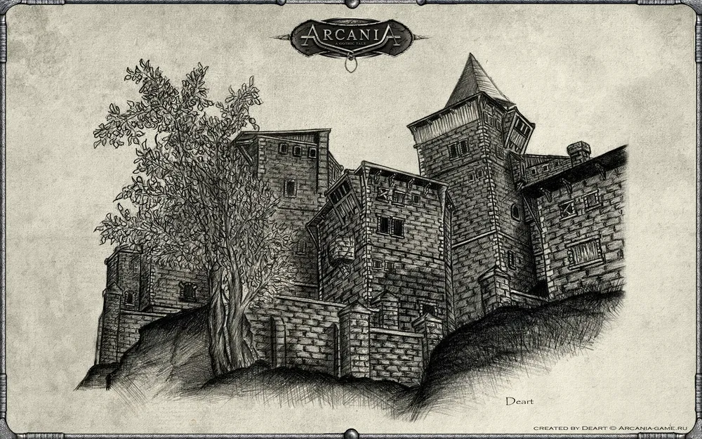 Пользуясь случаем, хочу выложить также и два предыдущих моих арта к Аркании. Рисунок замка Стьюворк, стоящего на отвесной скале, соединяемой с островом крепким каменным мостом.