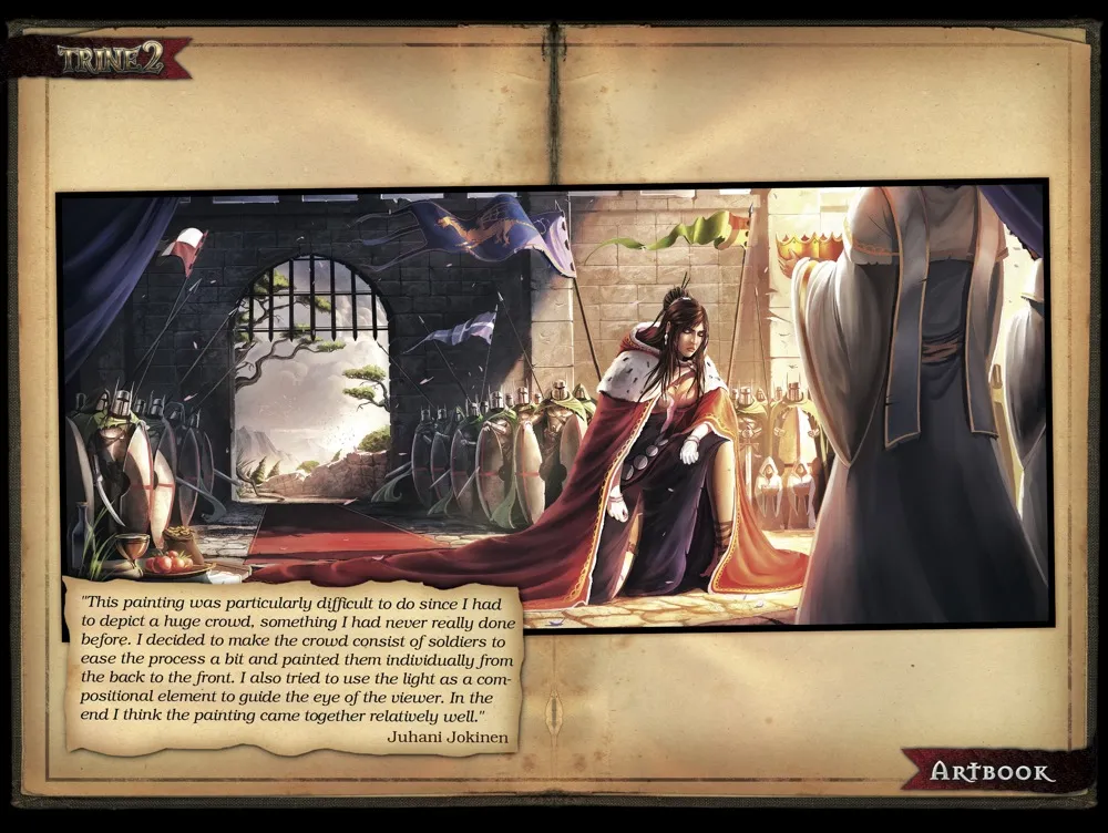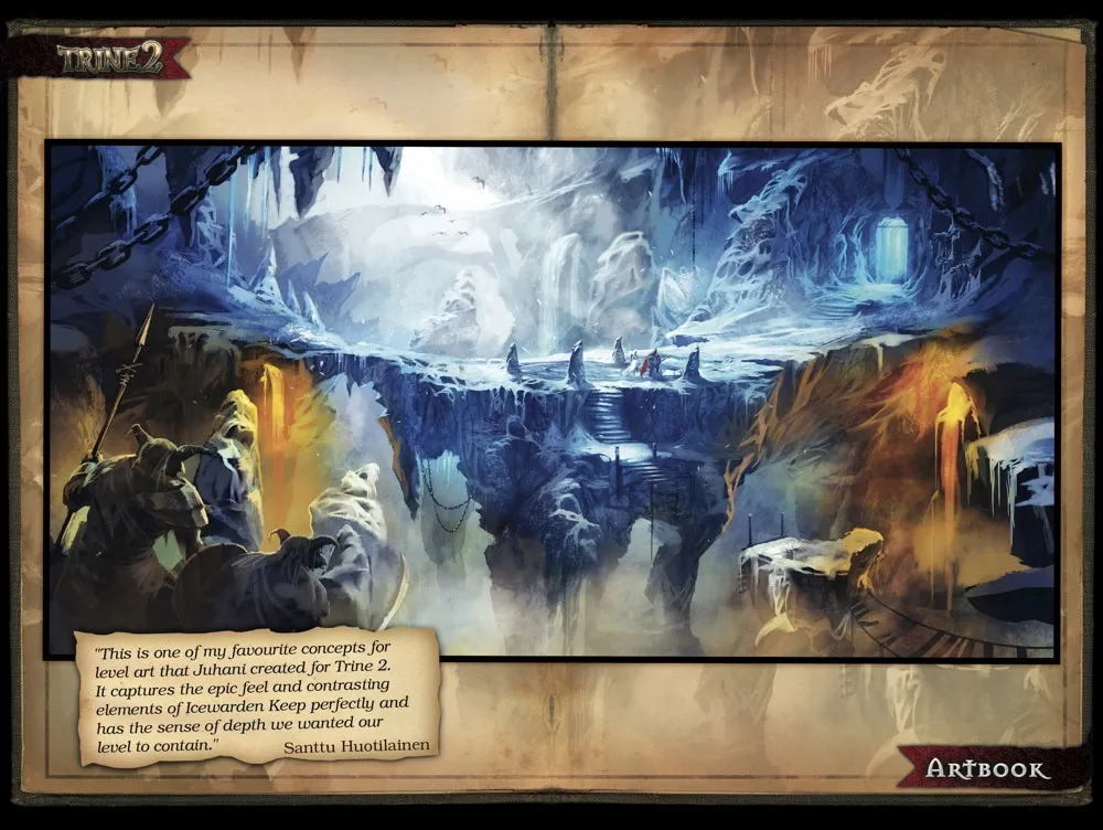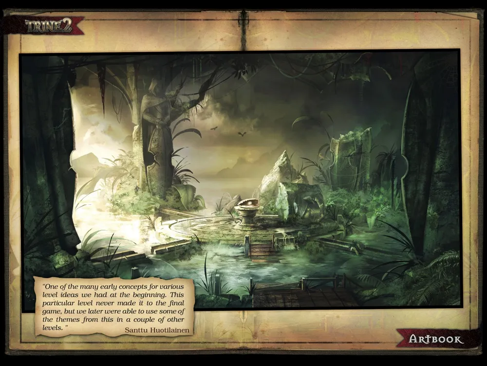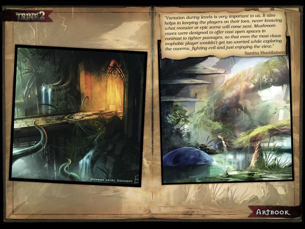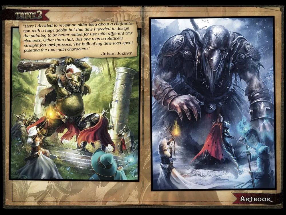 Полноценный качественный артбук по определению не может быть размером меньше тетрадки. Сравнивая картинки отсюда с нашим, скажу что тут они заметно светлее. Весь арт есть, у нас даже больше - например вот эти два кусочка полноценные http://www.gamer.ru/system/attached_images/images/000/465/039/original/Trine_2_Digital_Artbook_Page_11.jpg?1323791426