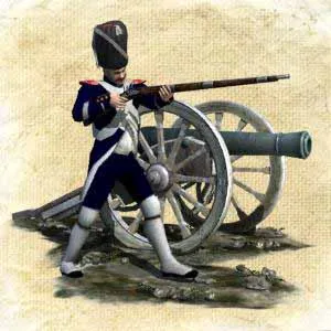Судя по униформе, это полк Гвардейской пешей артиллерии. Это элитное подразделение может вести точный артиллерийский обстрел противника, нанося ему большой урон, при этом оно уязвимо для быстро перемещающейся кавалерии и рукопашных атак. Солдаты, которые укомплектовывают этот род войск, хотя и были вооружены полусаблями, слабо обучены рукопашному бою (кроме полусабель, они были вооружены укороченными ружьями гвардейского образца – прим. моё.). Сила подразделения заключена в пушках, которые рекомендуется размещать на достаточном расстоянии от места сражения. Сформированный в 1808 году, полк Гвардейской пешей артиллерии состоял из шести артиллерийских батарей и роты понтонеров. Понтонеры отвечали за наведение мостов, позволяя артиллерии быстро занимать огневые позиции. Был некоторые сомнения, к какому подразделению приписать понтонеров: к инженерам или артиллерии, но, в конечном счете, было решено определить их к артиллерии. Рота понтонеров, в течение семи часов, могла построить мост из шестидесяти - восьмидесяти понтонов, длиной приблизительно 500 футов или 150 метров. Если понтонов не было, то они могли построить переправу из подручных материалов.