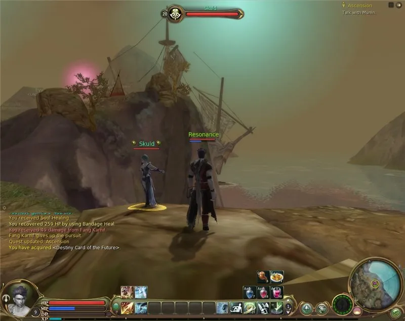 The Abyss Gate - Бежим к Nobekk'у, он отправляет к Derot'у. Поговорив с Derot'ом бежим к Munin'у, потом летим в деревню к Urd. Она отсылает нас в лес...к Verdandi после этого бежим к Skuld (он находится на обрыве около корабля). Возвращаемся к Munin'у.