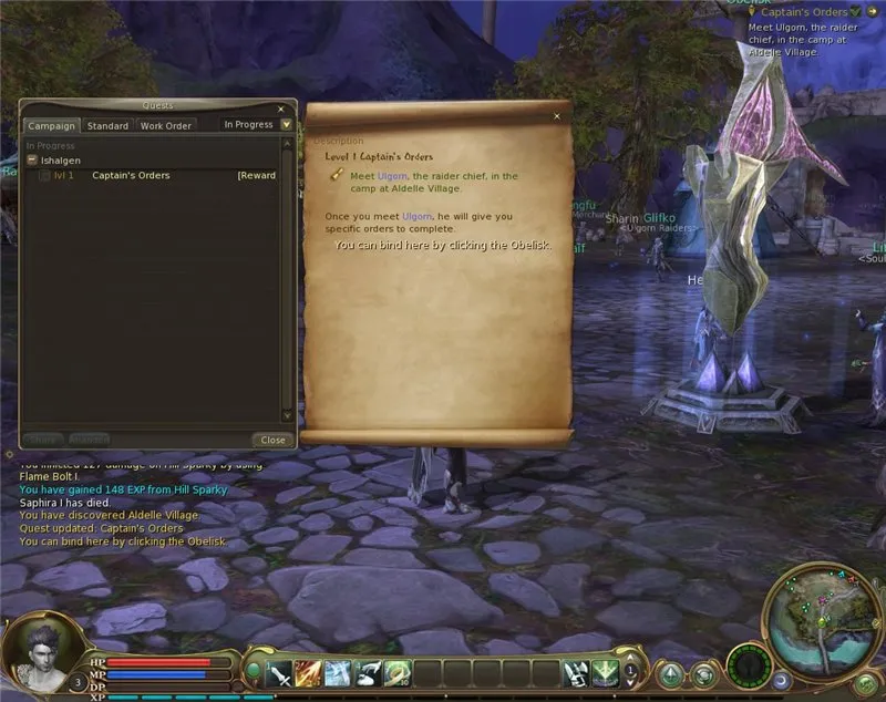 После перехода через мост у вас выскочит меню, из которого можно узнать, что появится новая ветка заданий называймая Campaign и возможность установить точку респа в этом городе. Чтобы установить точку вам необходимо подойти к статуэтки с крыльями Obelisk и иметь достаточное кол-во денег.