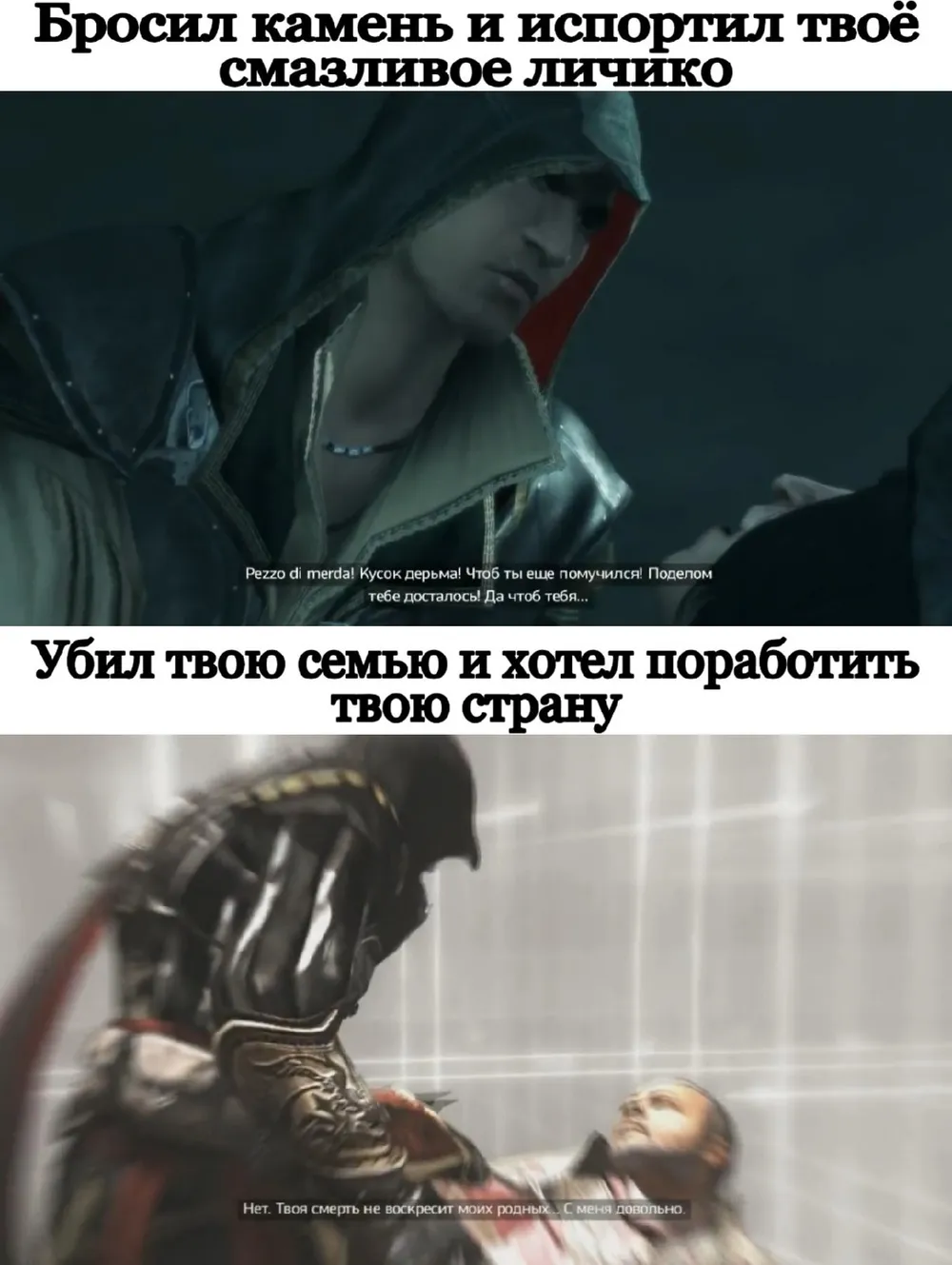 Мем, довольно наглядно показывающий эволюцию взглядов Эцио – от обычного мстителя до Ассасина