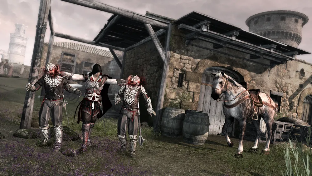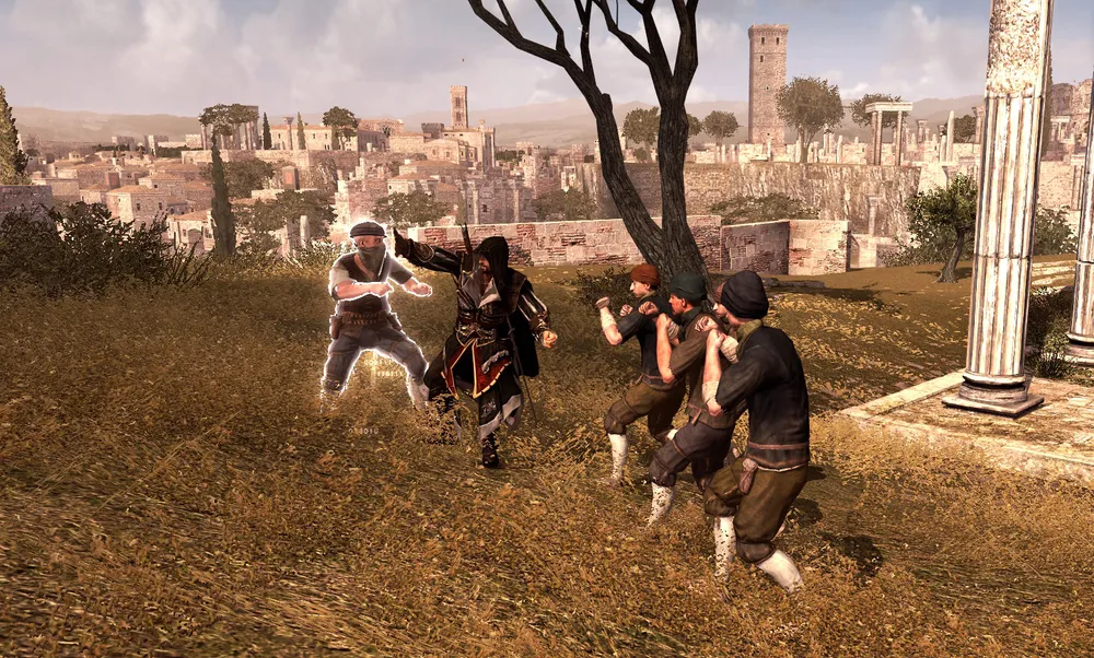 В-четвертых, система организации жизни игрового мира и взаимодействия населяющих его болванчиков приросла одной новой фишкой: в игре появилась фракция, в отличие от стражников ультимативно враждебная нашему герою, то есть даже при условии его нахождения на незапретной территории и нулевом уровне известности, – разбойники из «Ченто Окки», банды, служившей Борджиа. По сюжету, они враждовали с ворами Ла Вольпе, давнишнего союзника ассасинов. Столкновениям с ними были посвящены несколько основных и побочных заданий, но и между миссиями, во время фриплея, ребятки из «Ченто Окки» периодически устраивали на Эцио засады. В дальнейшем фича с ультимативно враждебной герою фракцией будет довольно часто появляться в играх серии, а ее конкретная реализация в виде конкурирующих преступных группировок станет основой сюжета в «Assassin's Creed: Синдикат».