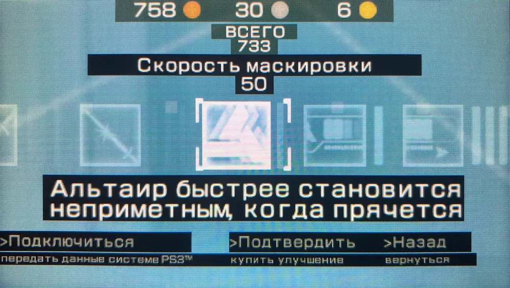 В игре присутствуют монеты тамплиеров разного достоинства – золотые, серебряные и бронзовые. Причем чем выше достоинство монеты, тем больше очков прокачки она приносит. На скриншоте общее количество доступных очков указано под надписью «Всего», а стоимость улучшения в очках – под его названием
