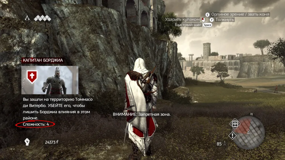 Башня сложности 4. Ее капитан, помнится, вымотал мне все нервы своей неуловимостью. Завидев Эцио, этот паскуда не кидался в бой, а улепетывал со всех ног, не давая мне даже приблизиться. И так раз за разом, пока я не спустила на него своих рекрутов