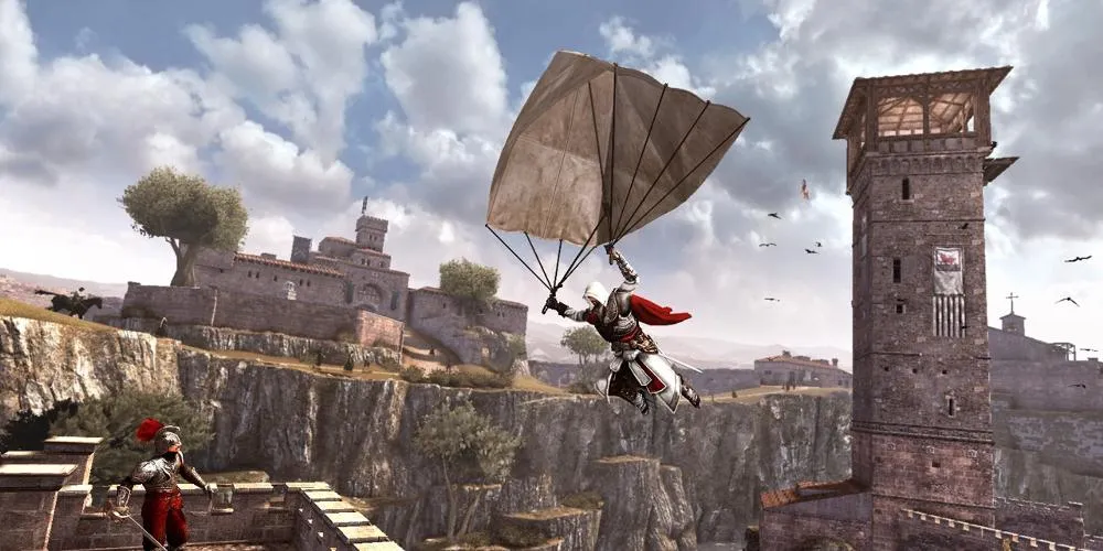 В-третьих, средства перемещения по миру претерпели кое-какие занятные изменения. В первую очередь это относится к лошадкам, которые теперь различались по своим характеристикам – обычные, скакуны и боевые – и «научились» появляться откуда ни возьмись по первому свисту хозяина. Механика верховой езды тоже приросла парочкой прикольных фич. Например, Эцио «освоил» зрелищный акробатический прием с запрыгиванием на всем скаку на балки и канаты, перекинутые над улицей. А при должной сноровке игрока ассасин умудрялся еще и вернуться обратно в седло, оперативно спрыгнув с балки на пронесшуюся под ней животинку. Не менее эффектно смотрелось и убийство всадника в прыжке с лошади на лошадь. Лодки перенесли из второй части без изменений и без какого-либо использования в рамках основных или побочных миссий. Короче говоря, в «Братстве Крови» они просто были как еще одна возможность перемещаться по миру. Ну а новинкой игры стал парашют – первая попытка ввести в серию быстрый, помимо прыжка веры, спуск с верхотуры на землю. (Полноценный фриран вниз появится только в «Unity», а безопасный прыжок с любой высоты и на любую поверхность с перекатом при приземлении – только в «Одиссее».) Систему быстрого перемещения несколько переделали. Если во втором «Ассасине» фаст тревел существовал только между городами-локациями и был для героя платным, то теперь появилась возможность задарма перемещаться из района в район в пределах одного города.
