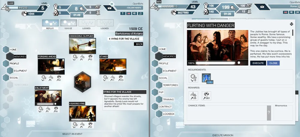 «Assassin’s Creed: Project Legacy»: окна событий и собственно миссии. Справа: воспоминания Бартоломео д'Альвиано; слева: миссия «Флиртуя с опасностью» из воспоминаний Фиоры Каваци