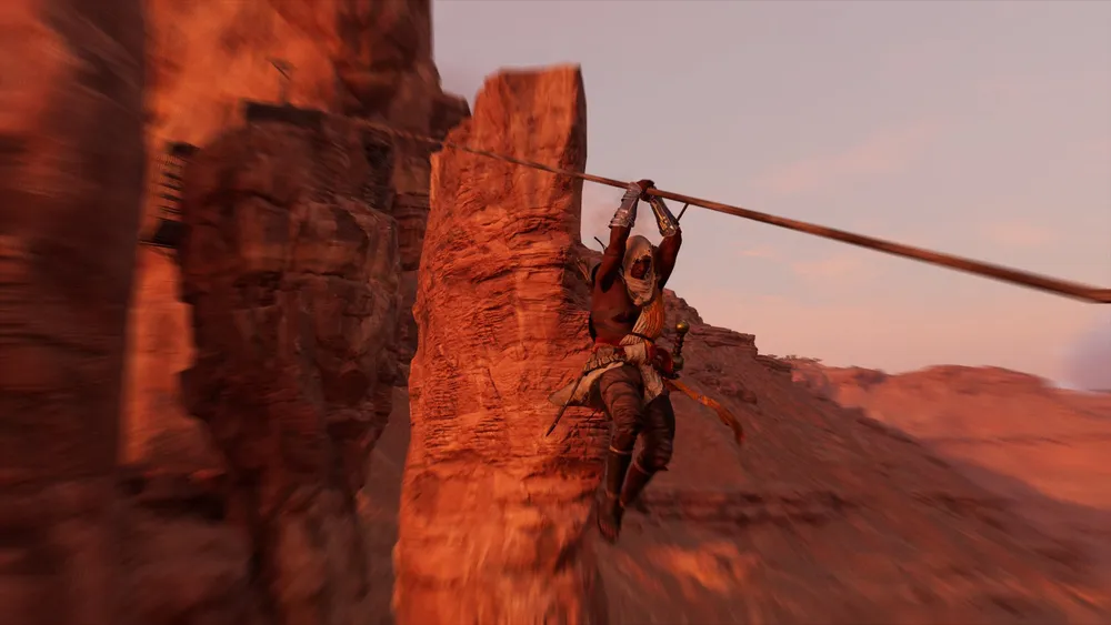 Древнеегипетский основатель Братства настолько суров, что ему для спуска по канату никакие вспомогательные девайсы не нужны. У него, видать, ладони из адаманта