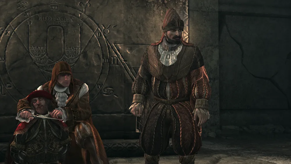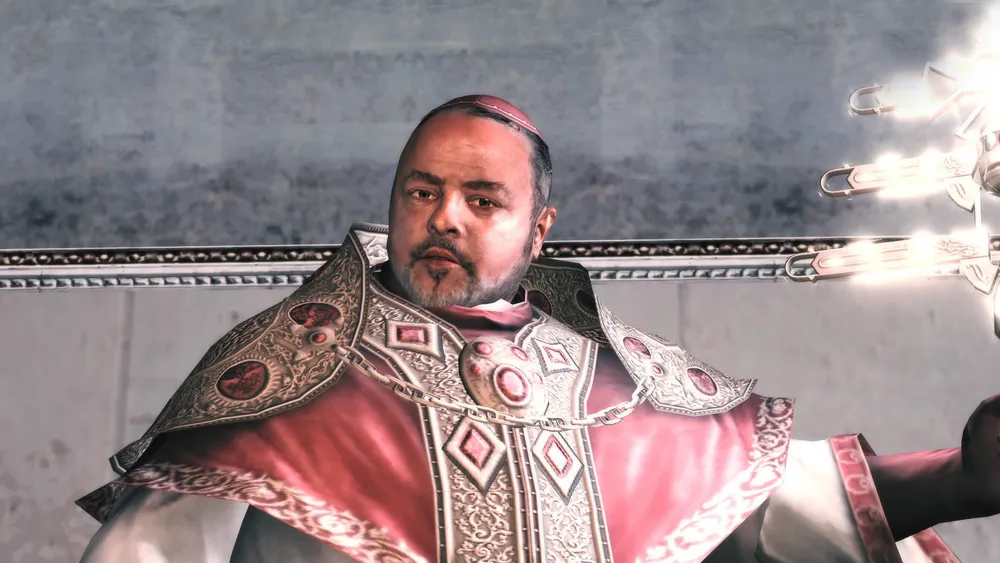 Историчность игровых локаций дополнялась введением в игру в качестве персонажей реальных исторических деятелей. Собственно, подобное имелось и в первом Ассасине – Ричард Львинoe Сeрдцe, Робер де Сабле, Рашид ад-Дин Синан (Аль-Муалим), однако во второй части виртуальных двойников живших в те далекие времена незаурядных личностей стало больше, а степень их известности – на порядок выше: Леонардо да Винчи, Никколо Макиавелли, Джироламо Савонарола, Лоренцо Медичи... Венчает же этот далеко не полный список Родриго Борджиа aka Папа Александр VI – заноза в заднице нашего героя и его противник номер один. Признаюсь, антагонист из него получился достойный – умный, коварный, могущественный, харизматичный. Пожалуй, папаша Борджиа – это лучший главгад за всю серию по «Assassin's Creed Истоки» включительно. Соперничать с ним может лишь его отпрыск – Чезаре Борджиа (по версии сценаристов из Ubisoft, тот еще моральный урод и отморозок, но не лишенный ума, отваги и полководческого таланта).