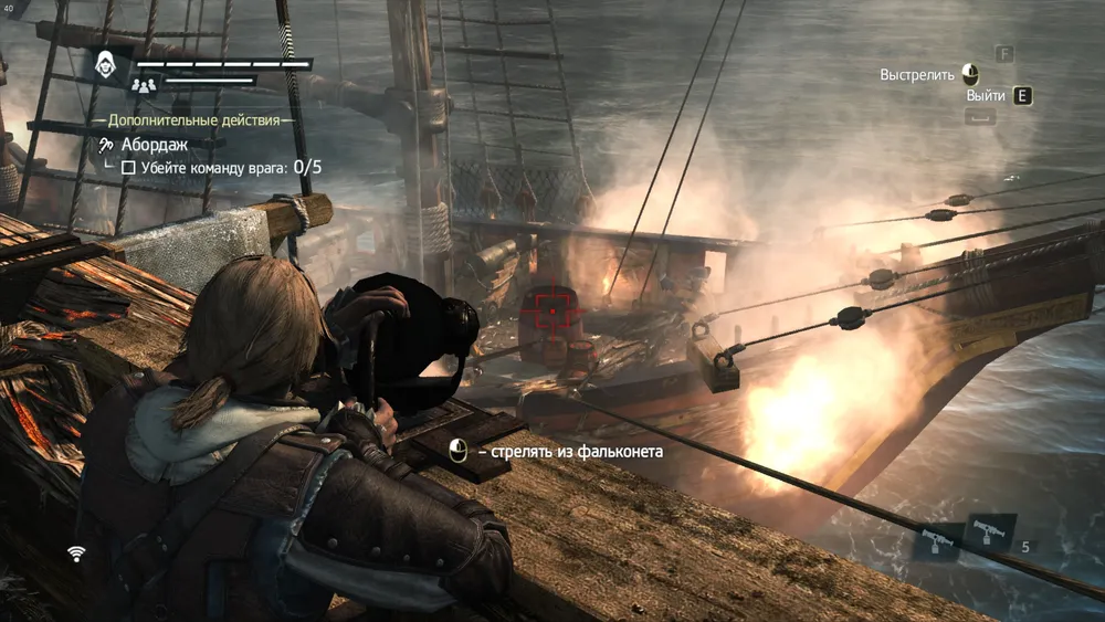 Управление кораблем осталось таким же, каким было «Assassin’s Creed III», разве что третью, особо быструю скорость добавили. Морская боевка, напротив, заметно изменилась – в чем-то приобрела, а в чем-то и потеряла. Основных плюсов три: 1) значительно улучшили систему и интерфейс прицеливания для бортовых пушек (теперь игрок точно понимал, куда он целится, в какую часть корабля); 2) к бортовым пушкам и фальконетам добавили носовые пушки, мортиры, а также бочки с горючей смесью, сбрасываемые с кормы (хотя стоит ли последние относить к плюсам – вопрос спорный); 3) боезапас корабельных пушек перестал быть бесконечным (да, в «Черном флаге» за количеством оставшихся ядер приходилось следить). В то же время увеличение орудийного разнообразия нашего брига сопровождалось пересмотром его тактических возможностей, и тут скорее вышел минус, чем плюс. Формально число доступных видов ядер осталось прежним – четыре (обычные, книппеля, тяжелые, мортирные), однако их воздействие на разные типы вражеских судов в «Черном флаге» унифицировали. Другими словами, смысл заморачиваться над тем, какой снаряд против какой посудины эффективнее, по большому счету, пропал. Убрали и необходимость вручную выбирать вид активных в текущий момент ядер в зависимости от боевой ситуации и типа приближающего противника. Вместо этого каждый снаряд жестко закрепили за соответствующим видом орудия: мортирные – для мортир, книппеля – для носовых пушек, обычные – для прицельной стрельбы бортовыми пушками, тяжелые – для неприцельной стрельбы на короткие расстояния из них же. Книппеля лишили ультимативной способности обездвижить противника с одного удачного выстрела. Отчасти их функция перешла к мортирным ядрам, наносящим огромный урон и тем самым ускоряющим потерю «здоровья» вражеским кораблем. Судно, потерявшее все «здоровье», утрачивало возможность двигаться и стрелять – теперь его можно было брать на абордаж. Каленые ядра заменили на тяжелые, которые тоже отличались от обычных бóльшим уроном, но годились только для не особо часто возникающей ситуации «борт в борт». Картечь, столь хорошо работавшую в «Assassin’s Creed III» против легких судов (шхун и канонерок), выпилили от слова «совсем». Появившиеся в четвертой части бочки с горючей смесью, может, и казались хорошей идеей на бумаге, но на деле вышли малопригодной фичей. Их недостаточно было просто сбросить, их надо было еще дополнительно поджечь выстрелом из орудий, причем желательно в тот самый момент, когда судно противника окажется поблизости, иначе толку от них выходило нуль (в «Assassin’s Creed: Rogue» сей момент пофиксили – там с кормы лилось уже по умолчанию горящее масло). Осталась в прошлом и прикольная фишка с расстрелом из фальконетов поврежденных пороховых отсеков больших кораблей. Впрочем, эта потеря производит впечатление осмысленной, поскольку такого рода механика не вписывалась в новое видение конечной цели морских боев – не потопить, а взять на абордаж.