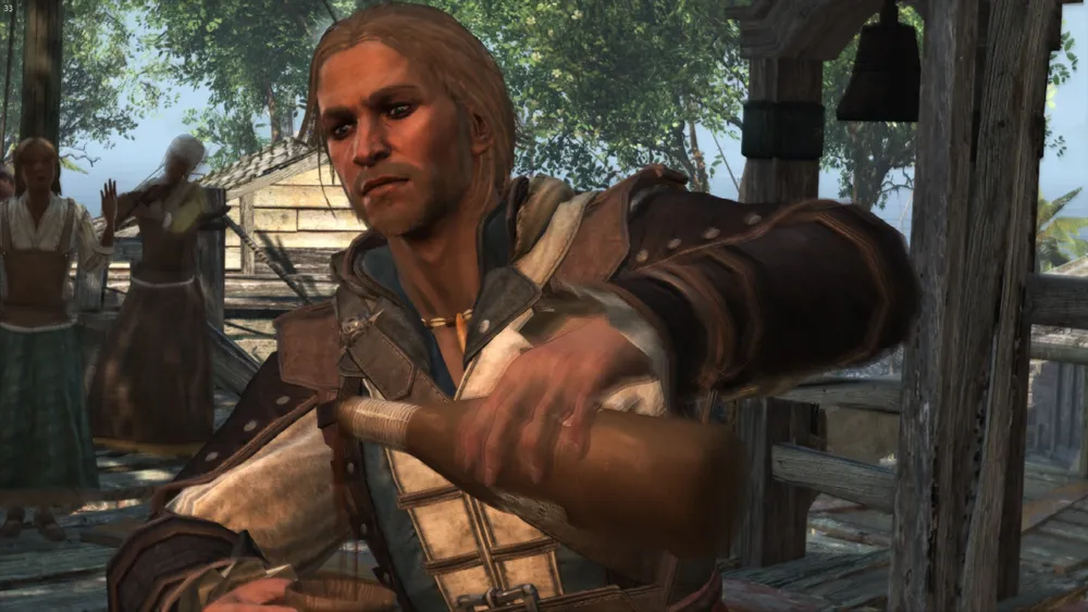 Боевые комбо, стелс умения и фирменные ассасинские приемы герой «Assassin's Creed IV: Black Flag» целиком и полностью перенял у своего внука из третьей части, как и систему автовосстановления здоровья. Новой была разве что возможность свистеть из кустов с целью подманить стражника (Коннор в оригинальной версии игры 2012 г. почему-то умел свистеть только из-за угла и из стогов с сеном); плюс, добавили новый вид укрытий – небольшие пристройки-сарайчики. Полагаю, они заменили собой беседки с занавесками на крышах, канувшие в Лету после «Assassin's Creed: Revelations». Заботиться о понижении уровня известности на суше Эдварду не приходилось вовсе: стоило успешно скрыться или перебить всех врагов, и его статус автоматически становился инкогнито. Главную ассасинскую сверхспособность немного усовершенствовали: в отличие от своих предшественников, Эдвард мог, посмотрев на врагов и квестовых персонажей в режиме орлиного зрения, как бы пометить их, после чего они оставались «видимыми» даже сквозь стены (затем эта фишка перекочевала в последующие игры). Одновременно немного упростилась и механика слежки. Отныне непосредственного визуального контакта с целью не требовалось. Достаточно было пометить преследуемого с помощью орлиного зрения, а потом просто направлять взгляд в его сторону. Дома и прочие препятствия, разделявшие героя и цель, более не являлись помехой. Однако стоило Эдварду начать смотреть в иную сторону, моментально запускался таймер. Но и в этом случае «Черный флаг» оказывался казуальнее лояльнее к игроку, чем некоторые из предыдущих частей: на помещение объекта слежки обратно в поле зрения (даже с учетом стен) отводилось 20 реальных секунд, а не 15, как, например, в третьем «Ассасине» (большее послабление присутствовало только в «Assassin's Creed II» – 25 сек.). Обнуление таймера, обнаружение или удаление от цели на значительное расстояние по-прежнему приводило к десинхронизации. Механика подслушивания не изменилась со времен «Assassin's Creed III». Оно все также происходило в движении и предполагало незаметное нахождение героя внутри радиуса слышимости.
