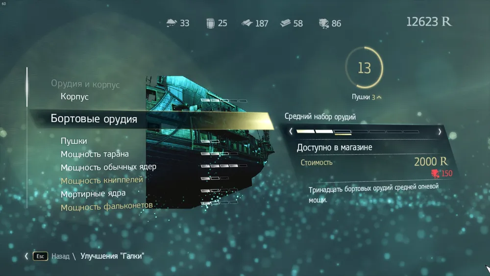 «Галка» в «Blасk Flаg» – это, по сути, самостоятельный персонаж со своим запасом «здоровья» и набором статов. Первое убывает, когда судну наносится урон (в бою или при столкновении с объектами окружения), вторые мы повышаем на протяжении чуть ли не всей игры. Автореген корабельного «здоровья» в бою невозможен, а вне боя оно самостоятельно восстанавливается лишь частично. Поврежденную посудину приходится чинить либо в порту за добытые нелегким пиратским трудом реалы, либо бесплатно прямо в море, пустив на это только что взятое на абордаж вражеское судно. Практически любой корабль противника сгодится в качестве «хилки» для «Галки», если, конечно, вы сумеете его одолеть. Прокачка личного брига нашего героя заметно усложнилась со времен третьей части. Для «Аквилы», если помните, Коннору достаточно было купить несколько улучшений, пусть и по немалой цене. Эдварду же понадобятся не только деньги (много денег), но и ресурсы – дерево, металл, ткань. А еще чертежи, без которых невозможно апнуть ряд характеристик до максимума. Ресурсы и реалы в хорошем количестве дропаются с побежденных судов, что делает их фарм жизненно необходимым занятием в четвертом «Ассасине». Чертежи извлекаются из разбросанных по игровому миру сундуков или же привозятся флотом Кенуэя (аналог собственного Братства из предыдущих игр – о нем ниже) из дальних стран. Выходит, лутосбором и игрой в игре также не стоит пренебрегать. Меню прокачки нашего брига включает около двух десятков позиций, каждую из которых предлагается улучшить от двух до семи раз – схема, напоминающая систему улучшений (upgrades) из «Assassin's Creed: Bloodlines» (в «Родословной», правда, позиций было меньше, всего семь; одни из них просто разблокировались, другие игра позволяла не только разблокировать, но и апгрейдить до второго или даже пятого уровня). А еще «Галку» (в отличие от «Аквилы») можно кастомизировать – менять ей паруса, носовую фигуру и штурвал, разнообразных вариантов коих тоже изрядное количество.