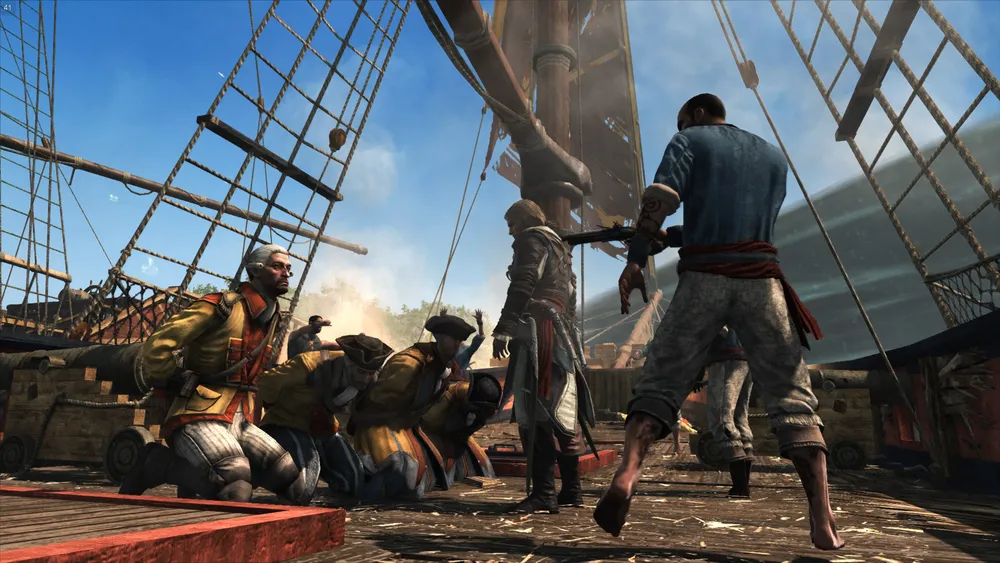 Своего Братства и рекрутов-ассасинов у мистера Кенуэя не было, а потому и позвать кого-то на помощь в сухопутном бою он не мог. На море, при абордаже ситуация складывалась иная. Матросы-боты из команды нашего героя активно участвовали в рукопашной на палубе захваченного судна. До имбовых подопечных Эцио, выносящих всех и вся, они явно не дотягивали, но кое-какую (пусть и небольшую) лепту в общую победу все же вносили. Правда, от гибели они тоже не были застрахованы. Восполнять убыль экипажа «Галки» игра предлагала несколькими способами: нанимать матросов в тавернах за деньги, спасать пленённых стражниками пиратов в городах (разновидность случайных событий, периодически появляющихся на карте), подбирать тонущих жертв крушения в открытом море (еще один вид случайных событий) и захватывать чужие корабли (после успешного абордажа сколько-то людей из вражеской команды обязательно присоединялись к капитану Кенуэю). По сути, команда нашего брига – это обусловленная особенностями сеттинга и сюжета замена рекрутам-ассасинам из предшествующих частей.