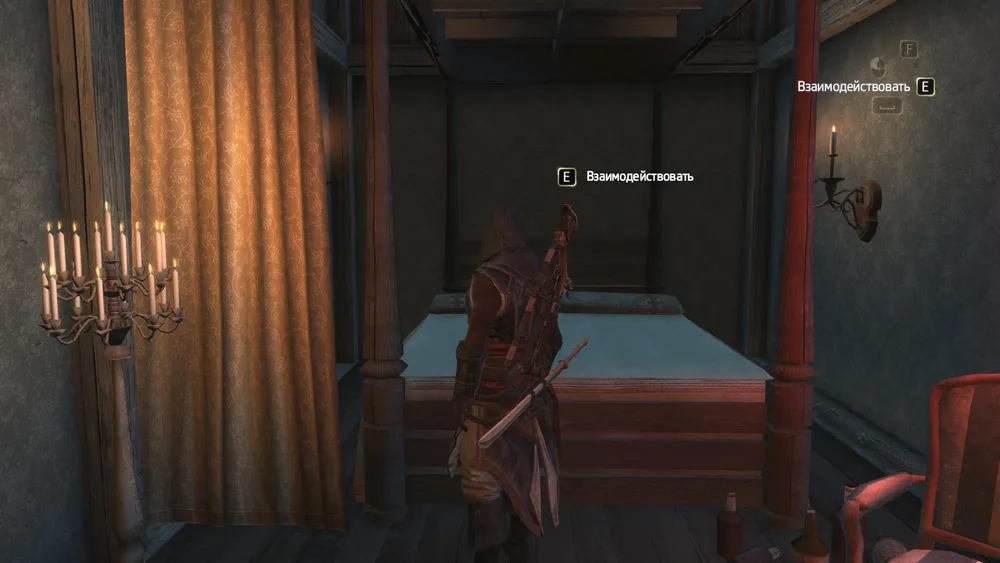 Помимо мордобоя и выпивки, разработчики добавили в игру еще один популярный среди пиратов вид досуга. Уже после завершения сюжетной кампании в поместье Эдварда, у дверей спальни я обнаружила ассасинку, с которой игра разрешала «взаимодействовать». Стоило нажать на предложенную кнопку, и девушка бросилась прочь из особняка. Если побежать за ней и догнать, экран потемнеет, а затем игра переместит героя обратно в спальню, где на кровати будет лежать та самая ассасинка. Однако это еще не все. Коли вы, прокачивая поместье, построили на его территории бордель, то теперь возле кровати вы найдете путану, тоже доступную для «взаимодействия». Нажмите соответствующего кнопочку, и после почернения экрана на вашем ложе окажутся уже две красавицы. Похоже, наш герой знает толк в развлечениях!