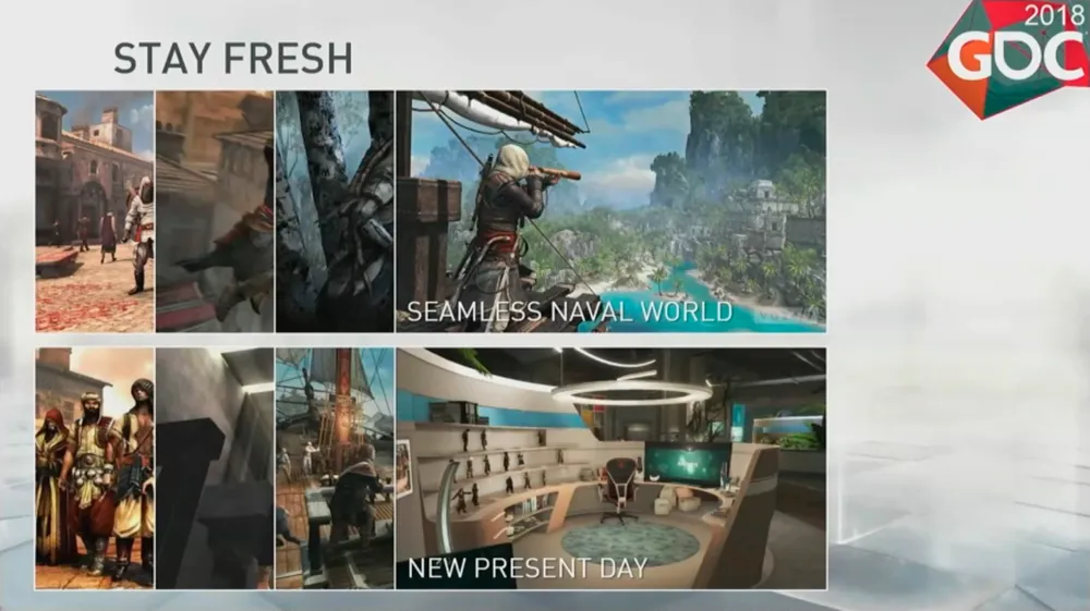 Однако всегда перед всеми командами стояла одна наиважнейшая цель: привнести что-то новое во франшизу и дать новые ощущения игрокам. В Assassin's Creed: Братство Крови это достигалось за счет добавления мультиплеера и Братства, позволявшего рекрутировать ассасинов и призывать их в бою. В Откровениях появился клинок-крюк и миссии Дезмонда, запертого в Анимусе, в настоящем. Дикая природа и морские миссии в Assassin's Creed III, бесшовный морской мир и новое настоящее в Черном флаге, новый движок и кооперативный режим в Unity, сразу два протагониста и канат как средство перемещения по миру в Синдикате – каждый из этих элементов привносил в игру нечто оригинальное и делал ее уникальной.