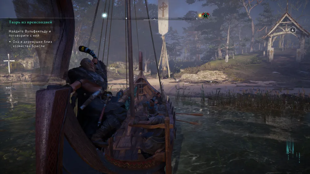 Рейды являются важной, даже неотъемлемой частью жизни викингов, поэтому мы часто будем путешествовать на лодке со своим отрядом, благо Англия просто испещрена мелкими реками. Завидев одинокое поселение или монастырь – мы можем тут же скомандовать атаку и судно аккуратно пришвартуется к берегу, позволяя нашим парням выбежать на битву с кровавой пеной у рта. Так как это вам не Black Flag, никаких корабельных сражений ждать не стоит, только если стрелять из луков по наземным целям. Удобно что наш кораблик может, как по-волшебству, возникнуть из воздуха стоит нам протрубить в специальный рог. На суше мы путешествуем пешком либо с помощью верного коня, который тоже быстро вызывается нажатием всего одной клавиши. Есть у нас еще один помощник в зверинцах – ворон Сюнин, на которого можно почти в любой момент переключиться и осмотреть местность в поисках секретов, интересных мест, врагов, или для создания великолепных панорамных скриншотов. Всех своих зверей и корабль можно кастомизировать, изменяя внешний вид, а лошадку можно даже чуть-чуть улучшить в конюшне своего поселения. Быстрые перемещения остались на месте – для разблокировки определенной точки достаточно забраться в позе орла на высокий выступ или башню; так же быстро перемещаться можно на свой корабль и в порты некоторых городов.