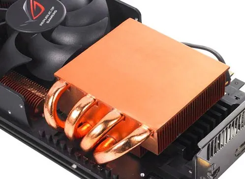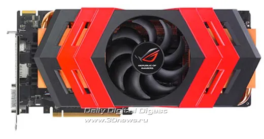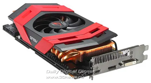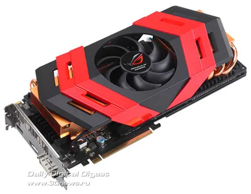 Эта очень необычная по исполнению модель из фирменной продуктовой линейки R.O.G. (Republic Of Gamers) построена на печатной плате оригинального дизайна с шиной PCI Express 2.1 x16 и основана на графическом адаптере ATI Radeon HD 5970 с парой изготавливаемых по 40-нм технологии чипов Cypress, каждый из которых обладает 1600 потоковыми процессорами. Суммарный объём имеющейся на борту памяти GDDR5 с 256-битным интерфейсом равен 4 Гб (2 х 2 Гб).За охлаждение ключевых «горячих точек» ускорителя отвечает оригинальный по конструкции кулер со 100-мм вентилятором в центре, который обдувает два крупных медных радиатора с четырьмя тепловыми трубками толщиной 8 мм каждый и ещё несколько медных радиаторов меньших размеров. Если говорить о наборе выведенных на заднюю панель интерфейсов, то тут присутствуют порты DVI, HDMI и DisplayPort.