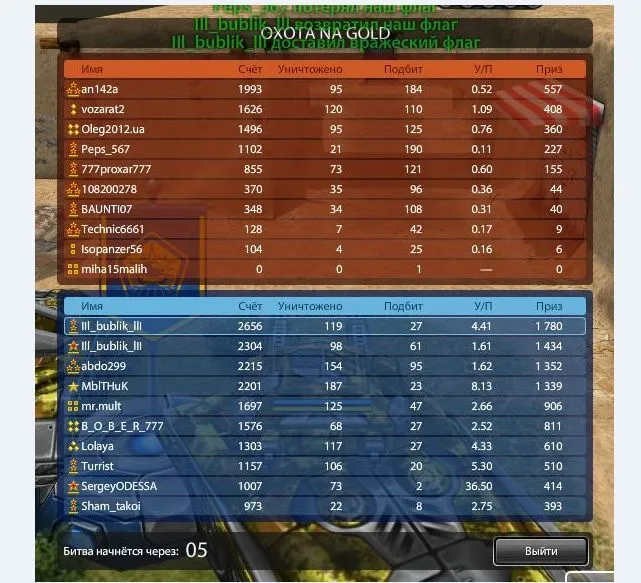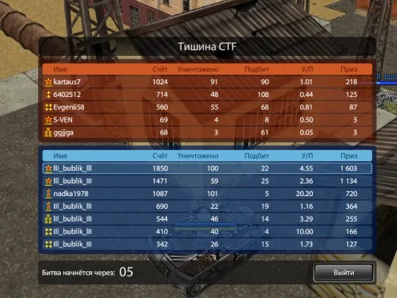 Минибубл: Самый запоминающийся бой: бродим по серверам, ищем подходящую битву и вдруг — «Тишина» на 100 флагов, счёт 95:13… Конечно же, заходим (пока заходили, счет стал 99:13) и вытягиваем данную битву просто с неимоверным трудом, проведя за компьютером, кстати, около четырёз часов. А смешные моменты… Когда Папабубл носится на Смоки и раздаёт всем «пендалей», испытываем просто потрясающее чувство наслаждения.