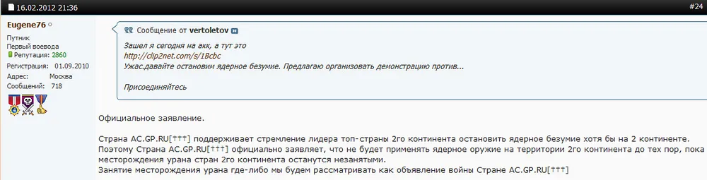 Страна AC.GP.RU[†††] поддерживает стремление лидера топ-страны 2го континента остановить ядерное безумие хотя бы на 2 континенте.