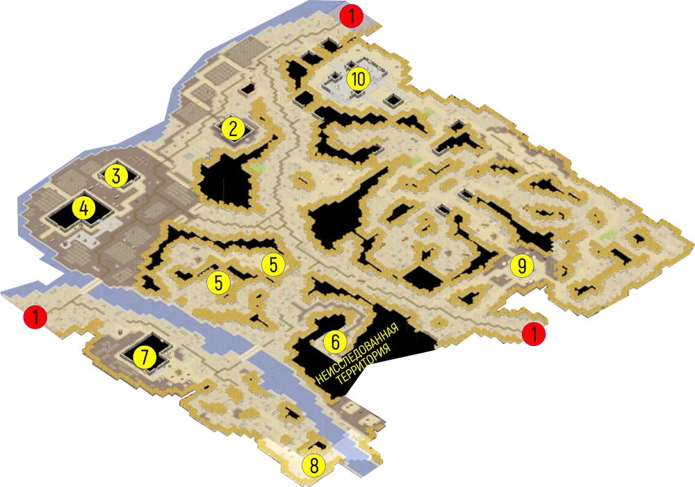 1 – переход в крепость Рокридж. 2 – заброшенная ферма. 3 – магазин Цесании. 4 – таверна “Набережная”. 5 – крысиные гнезда. 6 – форпост Ква. 7 – ферма “Небосвод”. 8 – логово наемников. 9 – лагерь наемников. 10 – портал.
