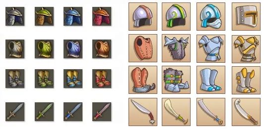 Оба наших художника работали удаленно и не могли уделять проекту много времени. Поэтому в целях экономии времени, на запуск игры мы подготовили набор из восьми иконок снаряжения и размножили их на все виды экипировки путем перекрашивания в разные цвета. С первого по пятый уровень иконки были серые, с шестого по десятый - зеленые, дальше синие, красные и так далее. Такой бюджетный подход неожиданно дал позитивный эффект: игрок с одного взгляда мог определить опасность потенциального противника. Четыре серых шмотки и две зеленых - можно смело на него прыгать. Три зеленых предмета и один синий - этот может и вломить. Пять синих и один красный - мама родная, откуда у него столько денег?